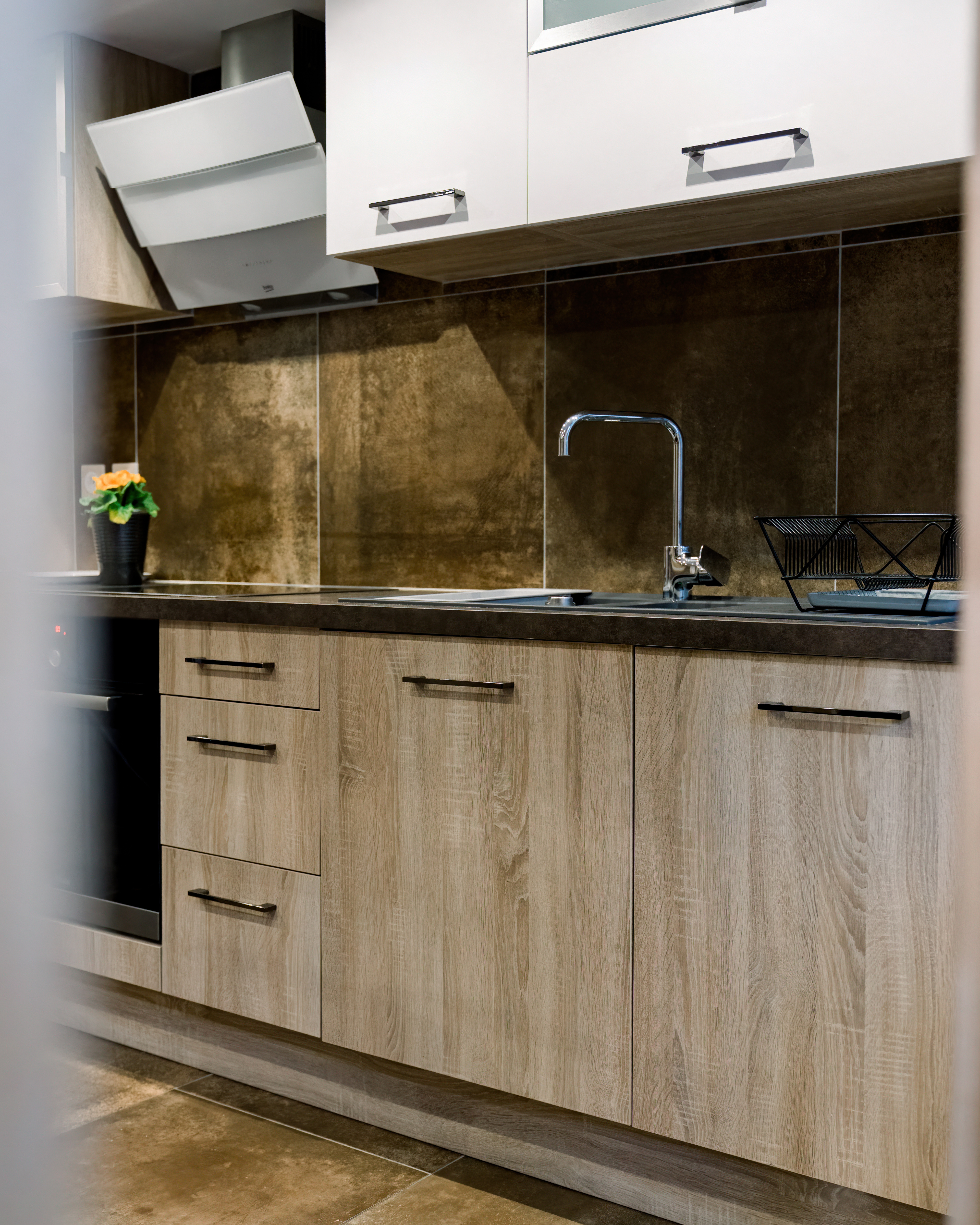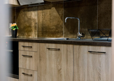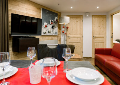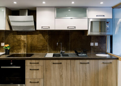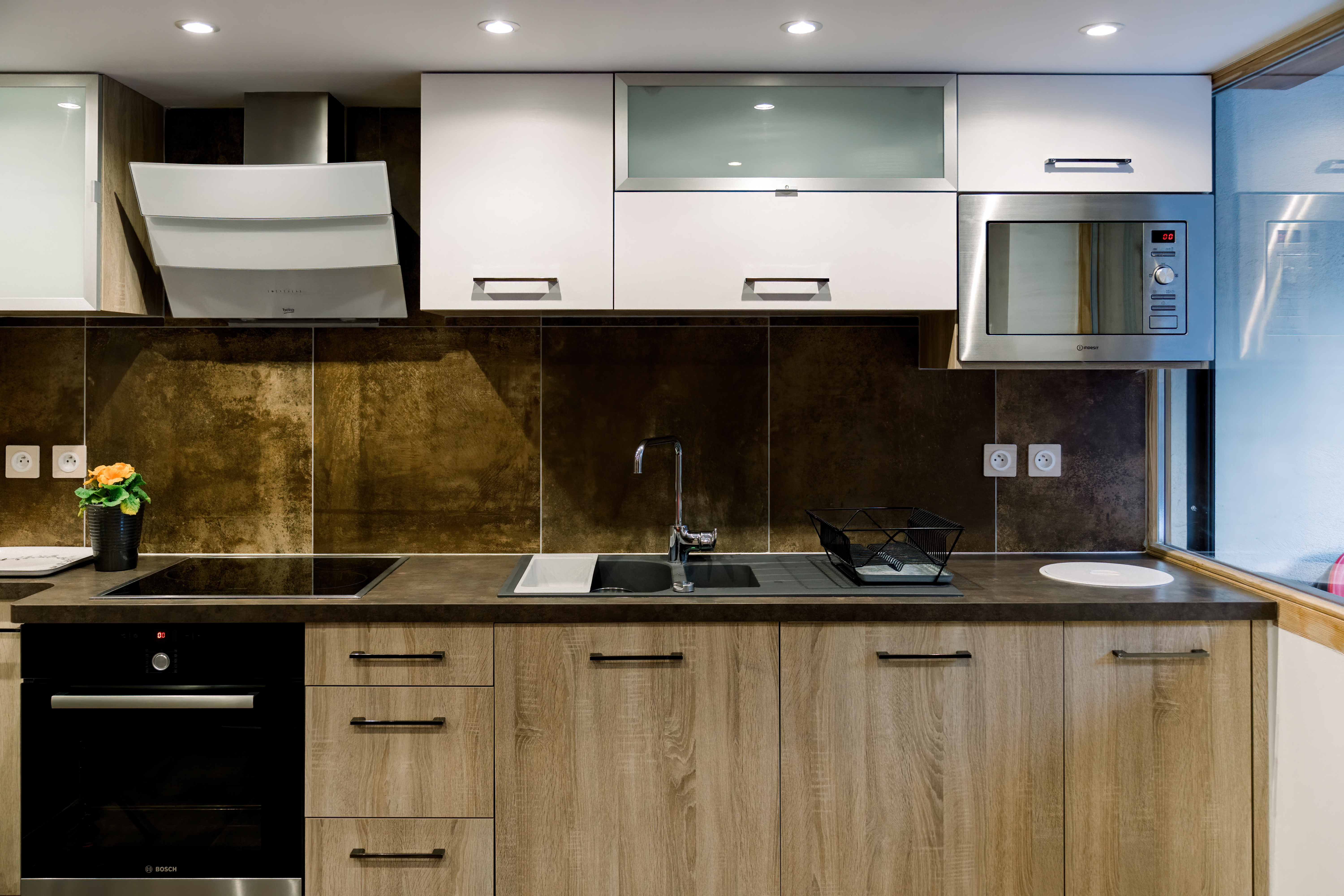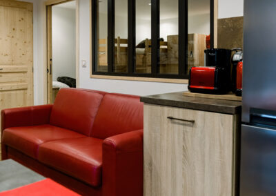 - Cuisine équipée SOCOO’C : plaques à induction, hotte, réfrigérateur-congélateur, lave-vaisselle, four à pyrolyse et micro-ondes, lave-linge et sèche-linge, cafetière Dolce Gusto, grille-pain, appareil à raclette…