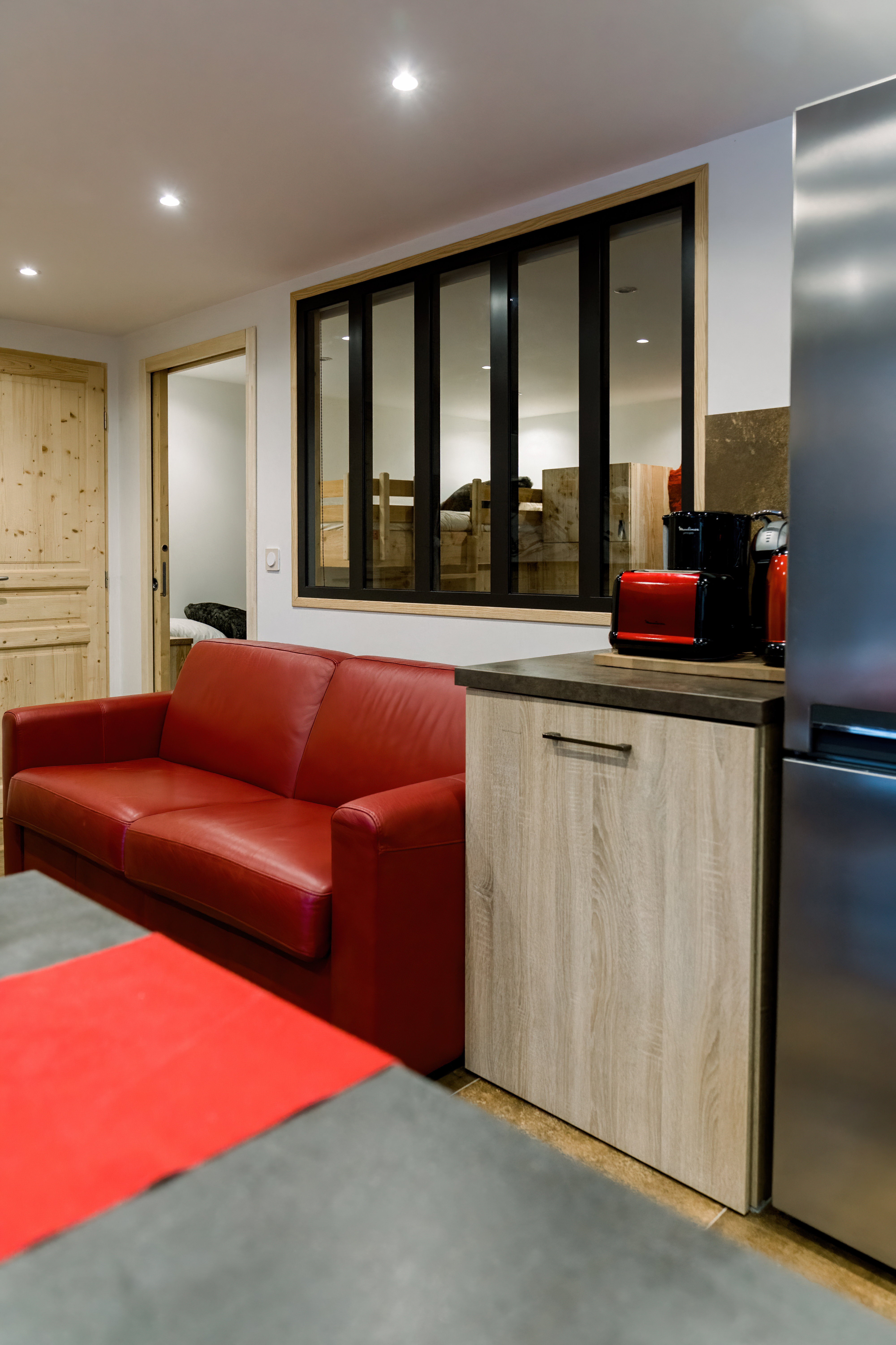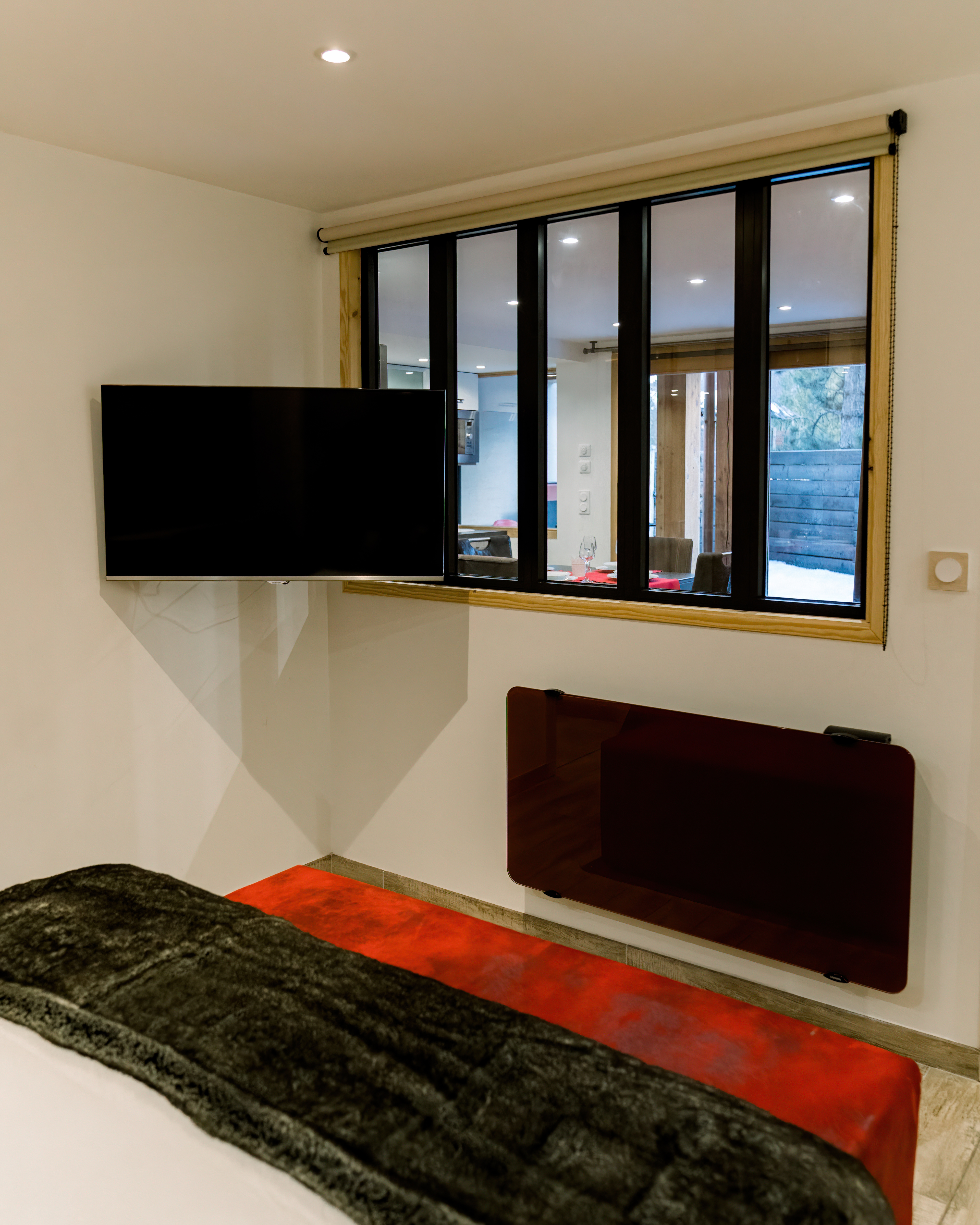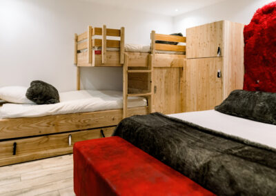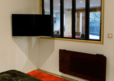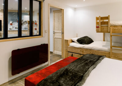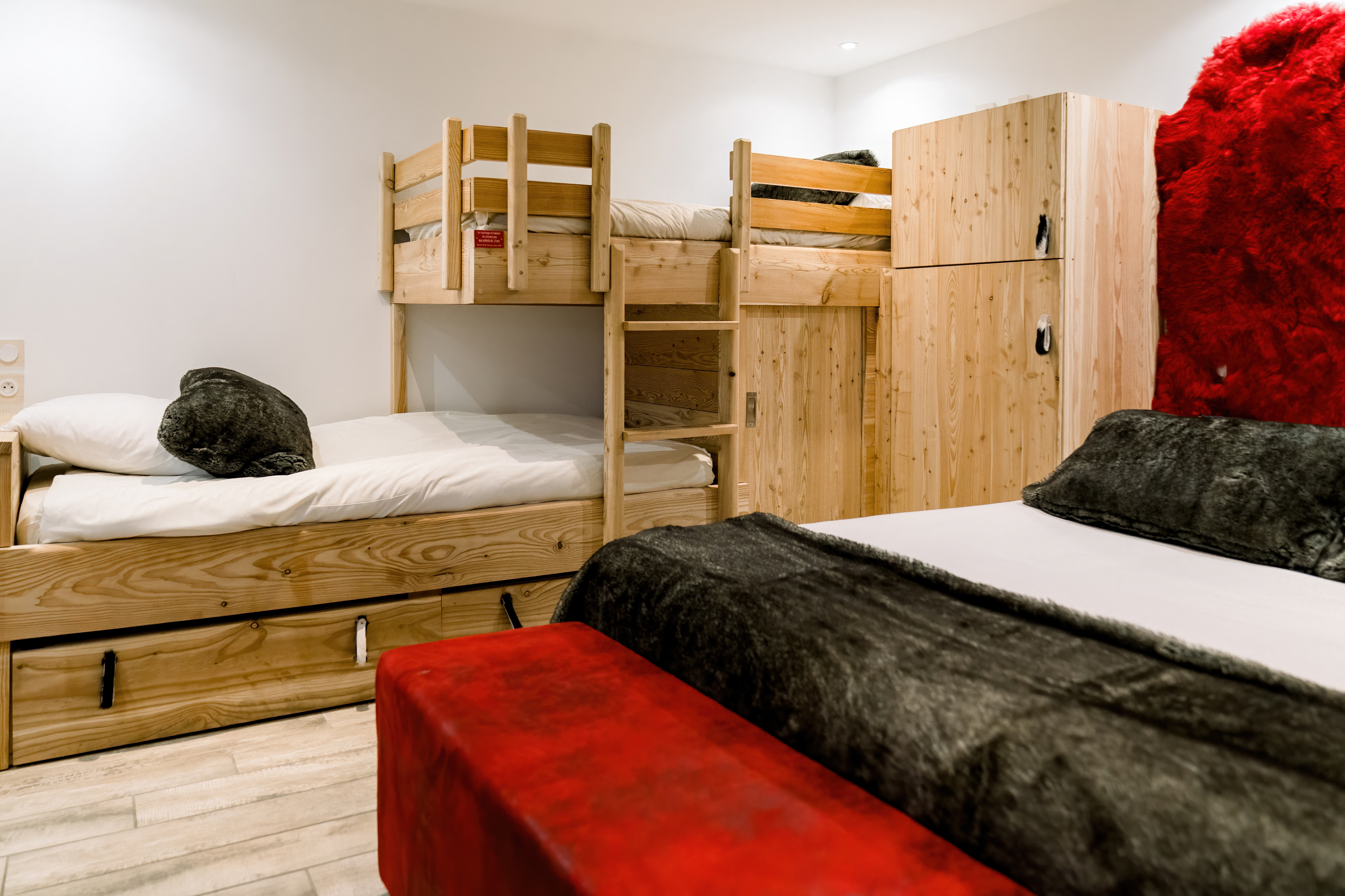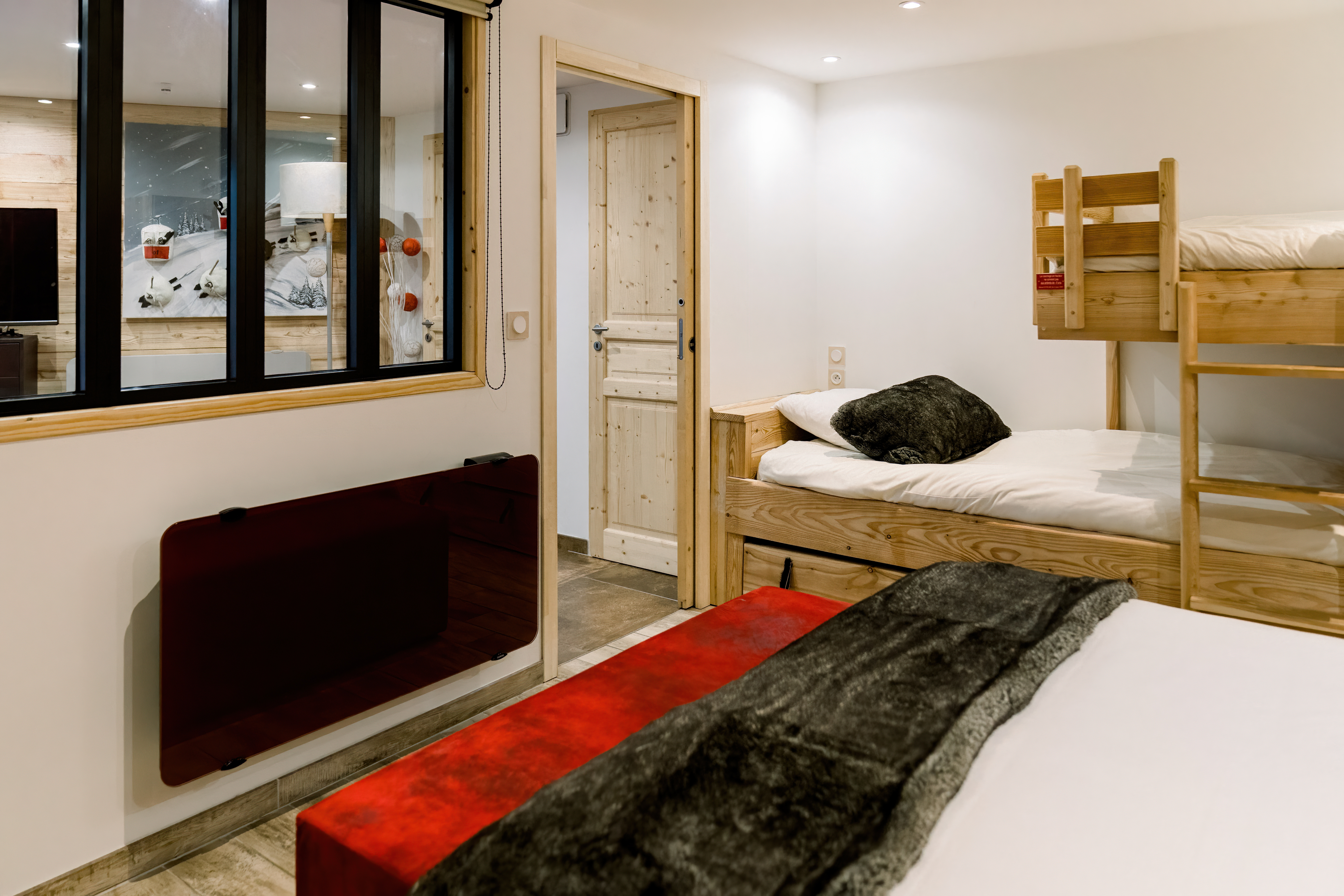 - Chambre avec 1 lit double en 160 x 200, écran-plat et un lit superposé en quinconce offrant 2 lits simples, placards et verrières d’usine.
