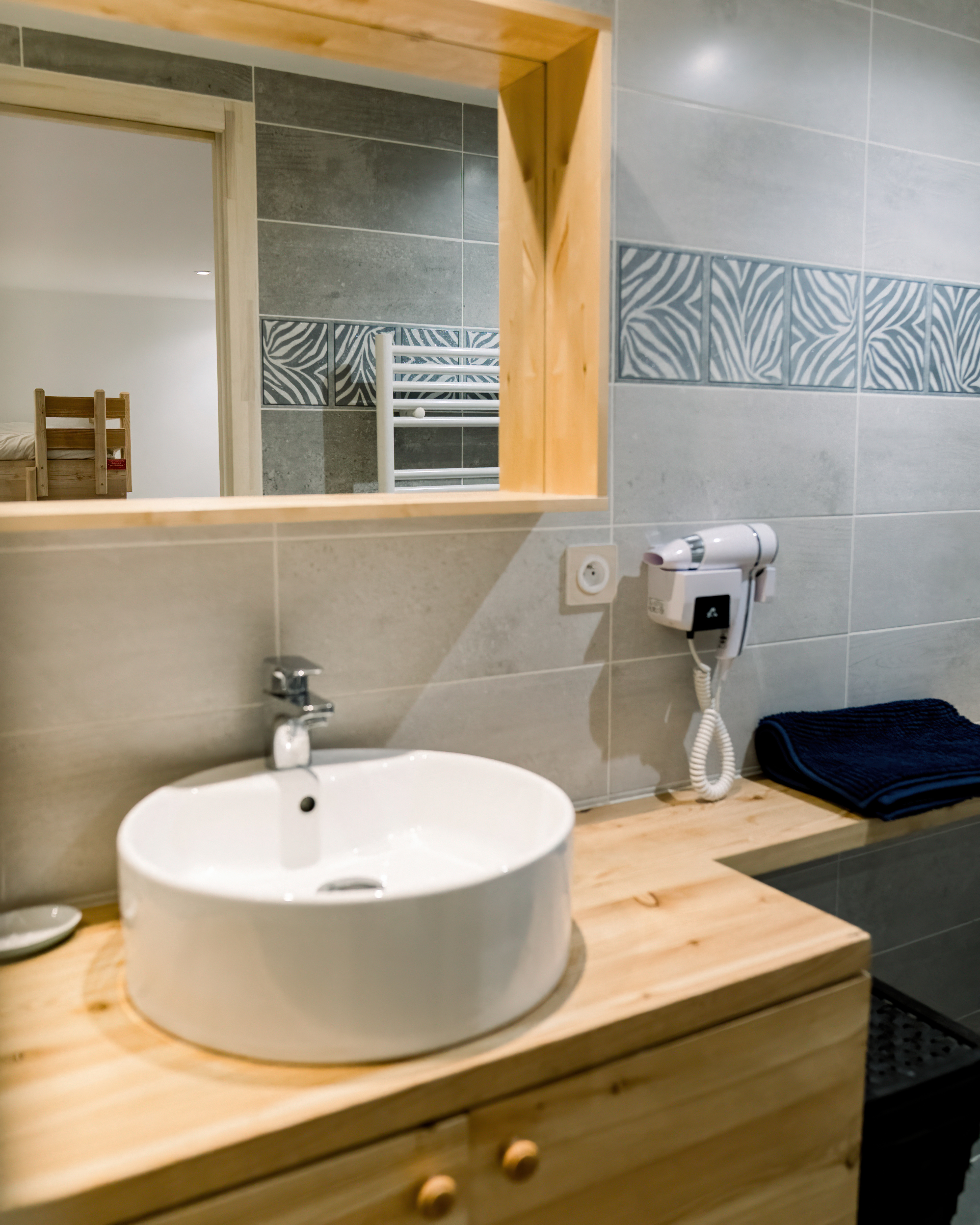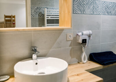 - Salle de bain avec douche en 120, vasque, sèche-serviettes, sèche-cheveux mural et placards, WC
