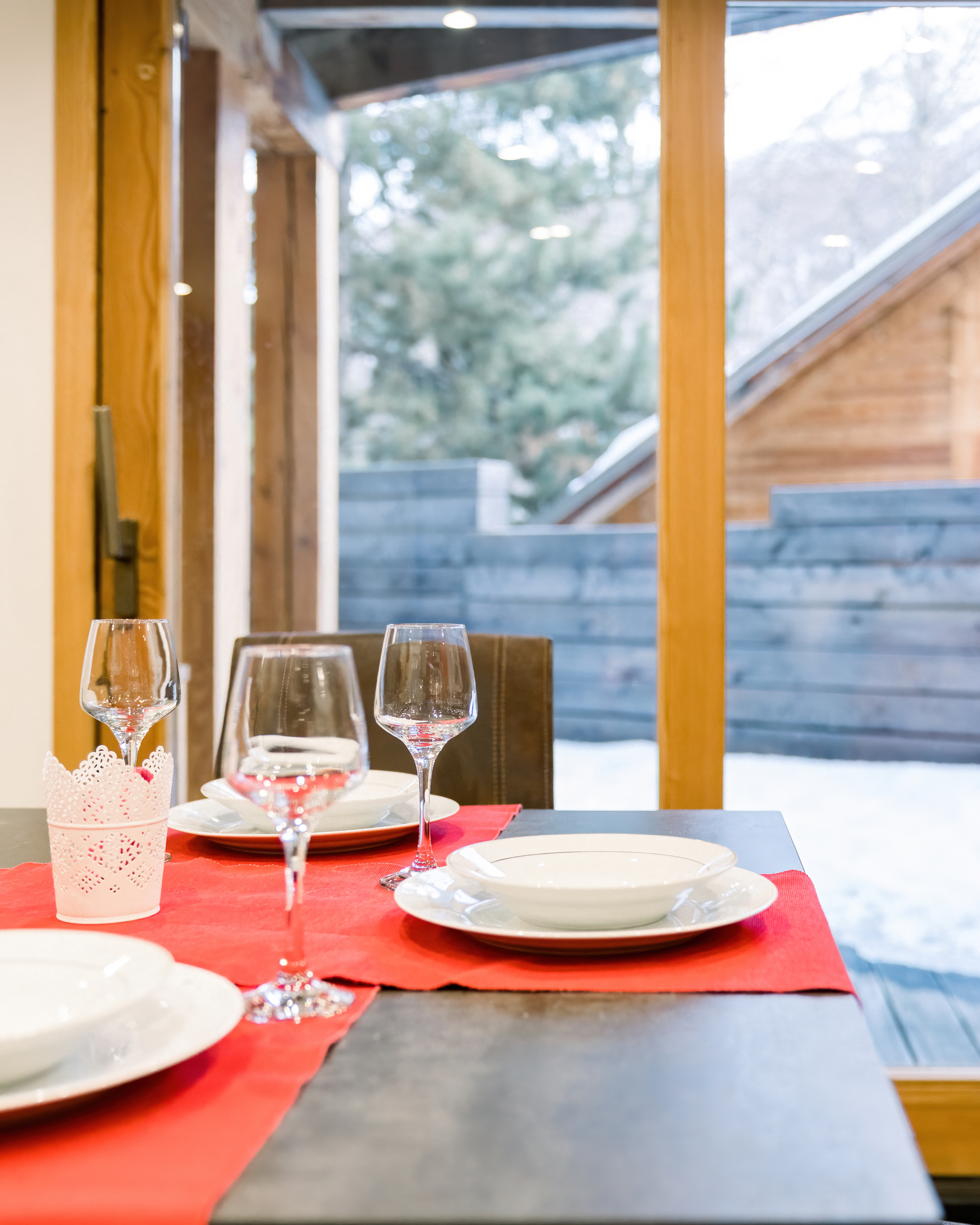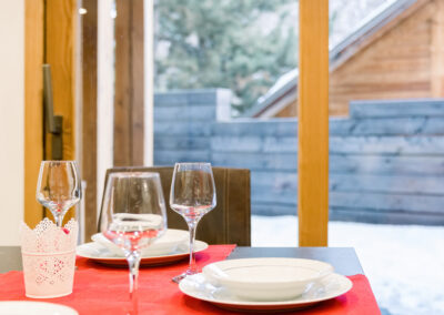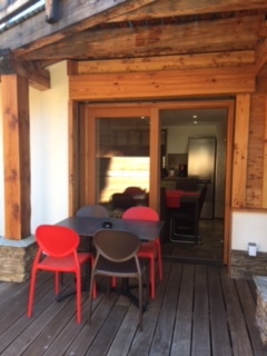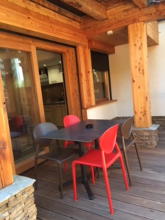 - Terrasse en bois exotique Bankiraï, côté Sud avec table et chaises GIO et terrasse côté Ouest avec vue sur la montagne et transats.